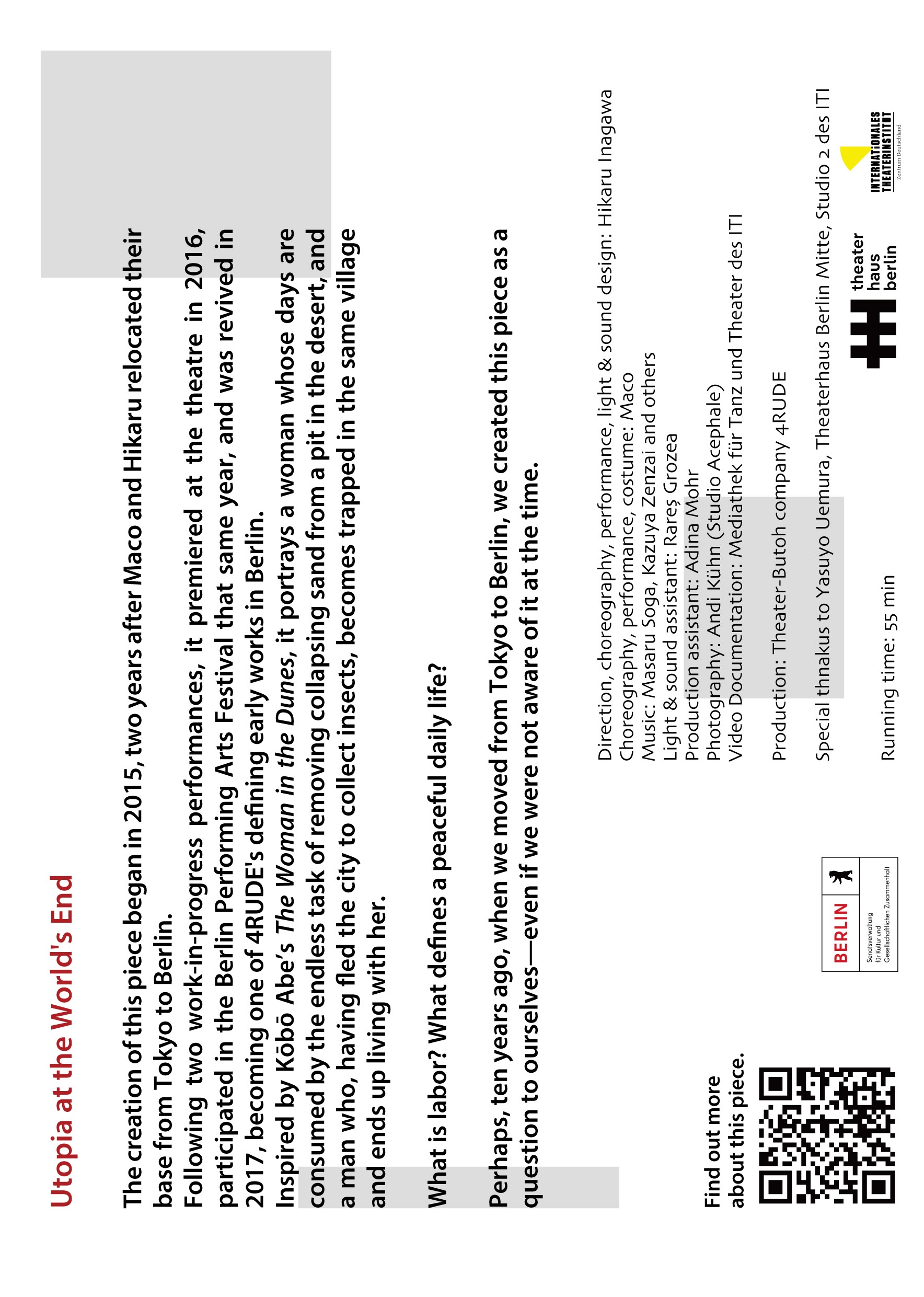 This piece is our second work in Berlin (2016). After two work-in-progress performances in the studio, during which we received valuable feedback from Berlin audiences, it evolved into a theatre production – a deeply memorable piece.